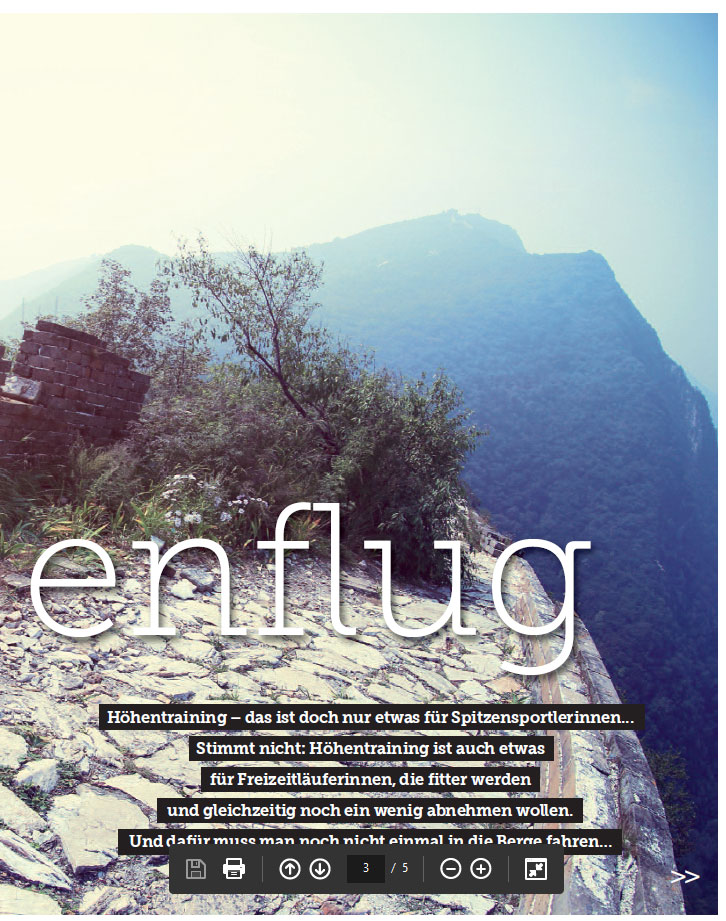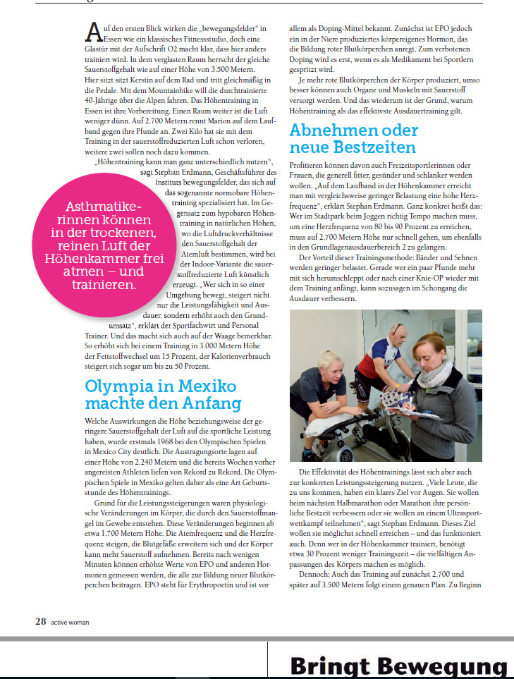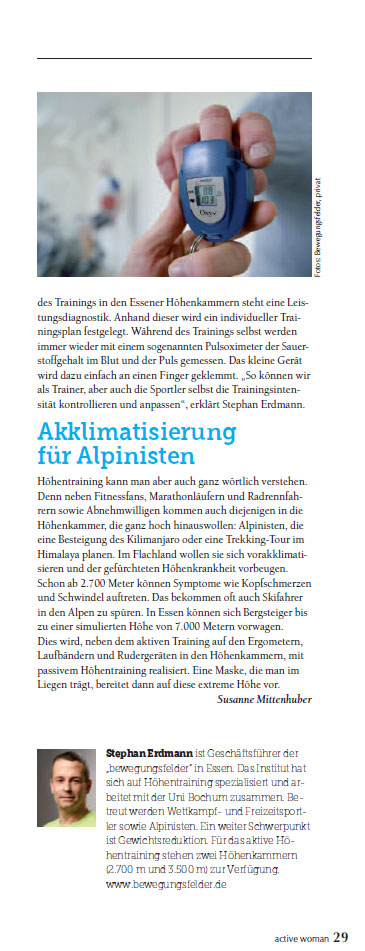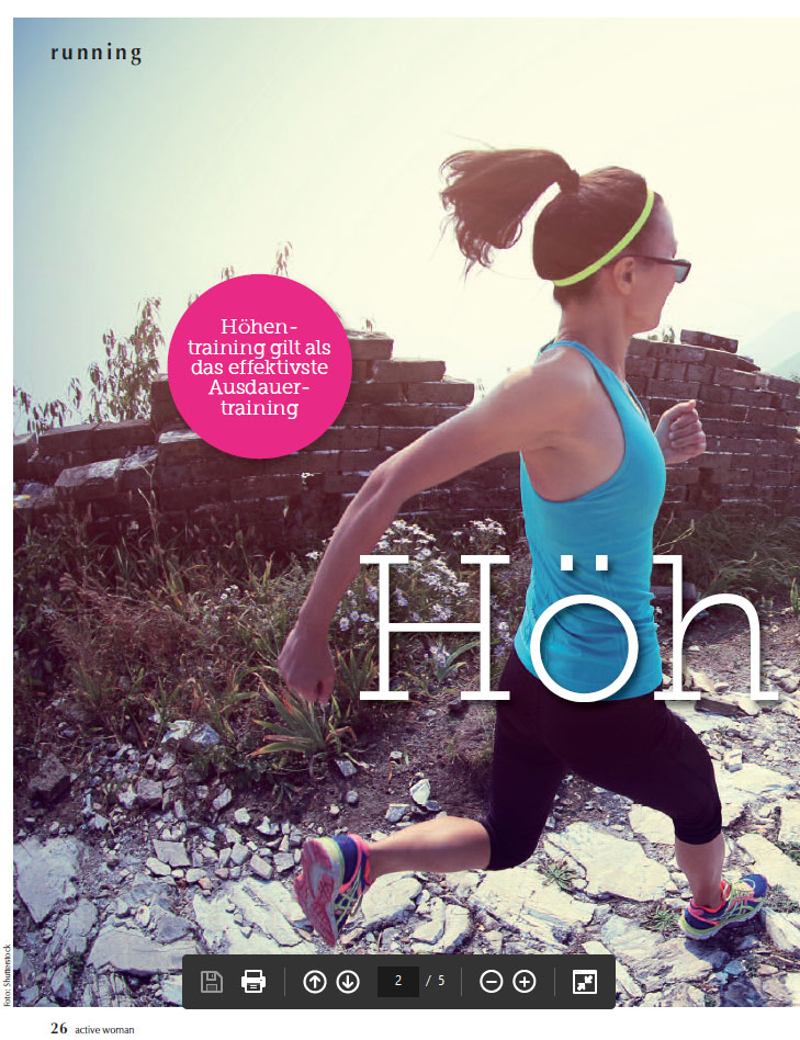 Die Zeitschrift “active woman” berichtet in der aktuellen Ausgabe 4/2016, welche gerade erschienen ist, u.a. über die Einsatzgebiete & Wirkungsweise von Höhentraining.