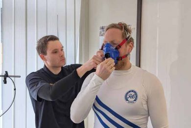 Zunächst wiegen wir Dich auf unserer Inbody-Analyse-Waage, die neben Deinem Körpergewicht auch die Verteilung von Muskel- und Fettgewebe ermittelt. Anschließend wählst Du gemeinsam mit uns die passende Atemmaske aus und führst einen Lungenfunktionstest durch.