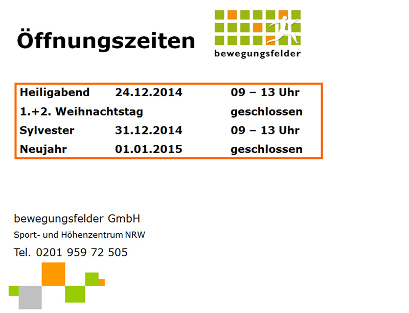Für alle, die vor und zwischen den Feiertagen noch Kalorien verbrennen wollen, hier eine Übersicht unserer Öffnungszeiten.