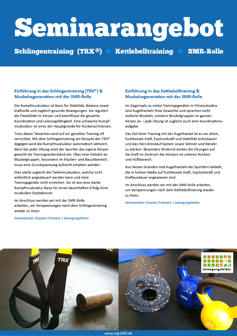bewegungsfelder! Und heraus kommt ein tolles Seminarangebot! Intensive Einblicke in das funktionelle Training mit Schlingentrainer, Kettlebells und die Muskelregeneration mit der SMR-Rolle!! Muskelkater garantiert ;-)!!