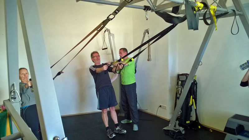 Wir haben mit Minibänder, TRX, Kettlebells und der black roll orange gearbeitet.