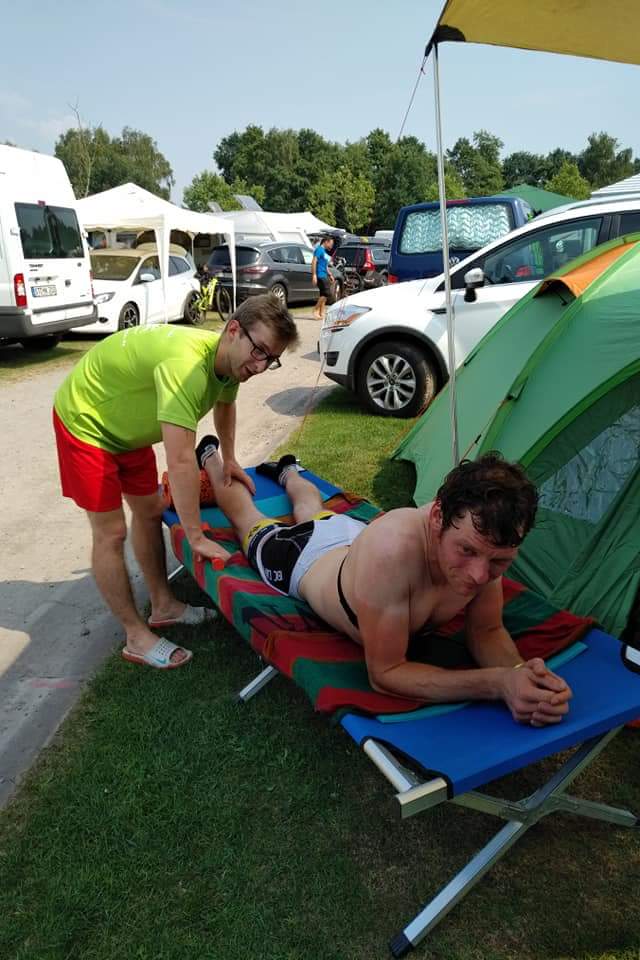 Hier sitze ich also auf dem Rasen vor dem Teamzelt, schlaff wie eine alte Spreewaldgurke, mit leerem Blick, müde auf einem Brot rumkauend. Meine Frau schaut mich sorgenvoll an und würde mir wohl auch am liebsten den Ratschlag geben, diesen Irrsinn abzubrechen. Würde es unser Team und die geniale Vorbereitung seitens Ingmar Hoetschel und Marko Trutschel nicht geben, ich wäre wohl drauf und dran gewesen eine zumindest seeeehr lange Pause zu machen. Aber dann taucht ein guter Geist auf. Er heißt Stephan Erdmann, seines Zeichens Chef von bewegungsfelder, und ein Experte in Sachen körperlicher Fitness. Er redet mir gut zu und meint, dass er mich schon wieder hinbekommt. Dabei wedelt er fröhlich mit einer Art Mini-Nudelholz und bittet mich, mein Bein auf seinem Oberschenkel abzustützen. Was jetzt folgt ist nicht ganz jugendfrei. Und wer gutes Kopfkino liebt sollte jetzt mit dem Lesen besser aufhören. Stephan rollt mit seinem Folterwerkzeug erbarmungslos auf meiner Wade hin und her. Wer sonst gerne seine Freizeit in SM-Etablissements zubringt, der wir sicher als angenehme Tagesgestaltung empfinden. Ich jedoch quieke wie ein Schwein – scheiße, tut das weh! Was zum Teufel er mit meinem Körper macht und warum er mich so quält will ich wissen. Trocken gibt der Experte „Faszientraining“ zu verstehen und fügt noch ein mahnendes „No Mimimi“ hinzu. Nachdem auch das andere Bein die Tortur hinter sich gebracht hat, bin ich froh, dass ich nicht vor lauter Schmerz in die Ecke gekotzt habe. Stephan übergibt mich an seinen Kollegen Patrik Werner, der mir noch die Waden und Schultern durchknetet. Auch dies tut weh, aber irgendwie ist mir das jetzt auch egal. Schlimmer kann es eh nicht mehr werden.